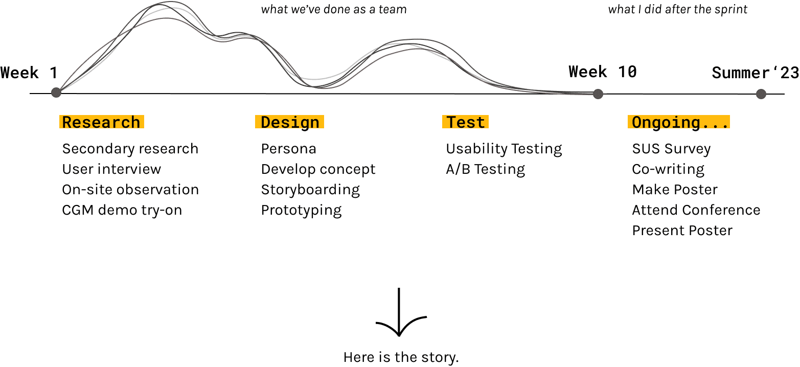 Here is a glance of our design journey, adopting the double diamond model. It helped us navigate in the diabetes world, understand our audience, define the right problem (so important), and come up with an impactful solution.