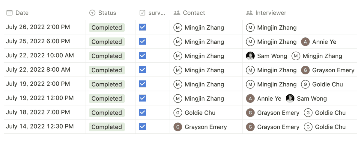 (I made this Notion page to manage our interview progress and led 5/8 sessions)